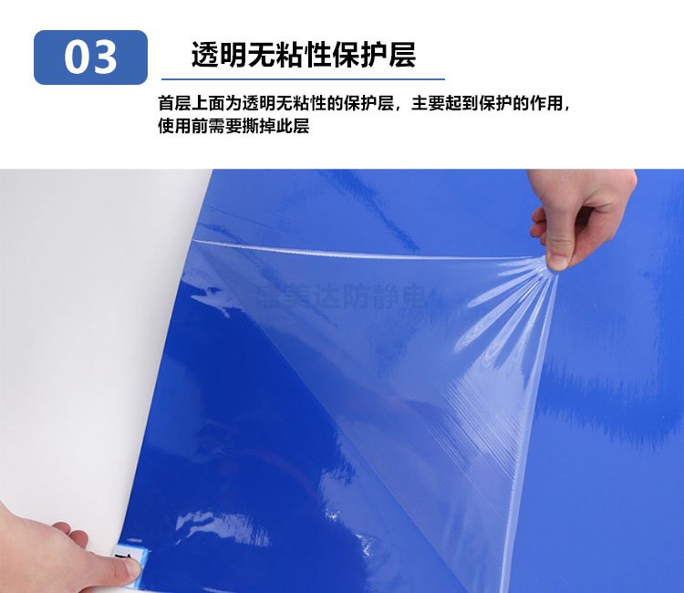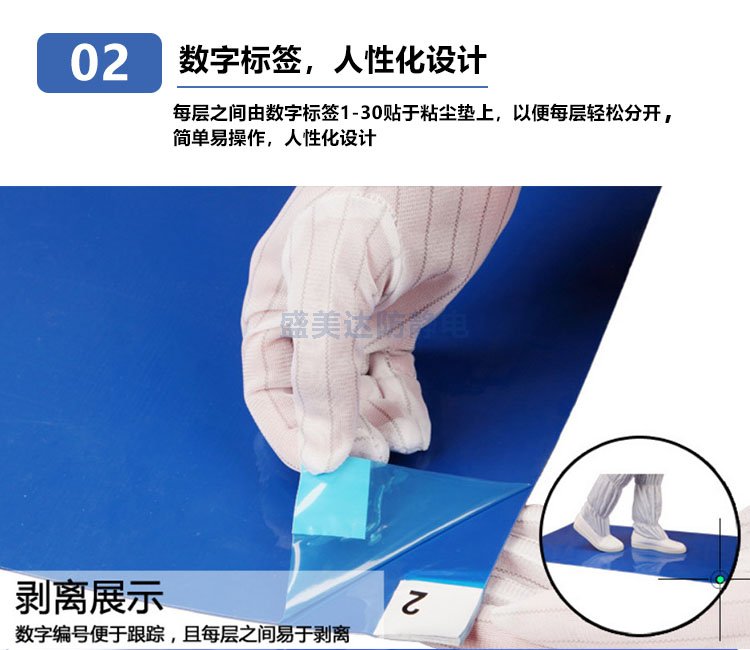 粘塵墊又稱粘塵地墊、粘塵地板膠,采用優(yōu)質(zhì)低密度聚乙烯材料和環(huán)保型壓敏水溶性粘合劑經(jīng)過特殊工藝復合而成,能使粘塵墊每層表面粘性均勻,不掉膠,無氣味,環(huán)保無毒,能快速有效清除運輸工具車輪和鞋底攜帶的灰塵,保持環(huán)境清潔。粘塵墊有30層,每層之間左上角或者右上角都有1-30或者30-1的數(shù)字標簽,以便于更換。主要應用于微電子、半導體、生物制藥,醫(yī)療器械、食品加工和醫(yī)院等各行業(yè)。
